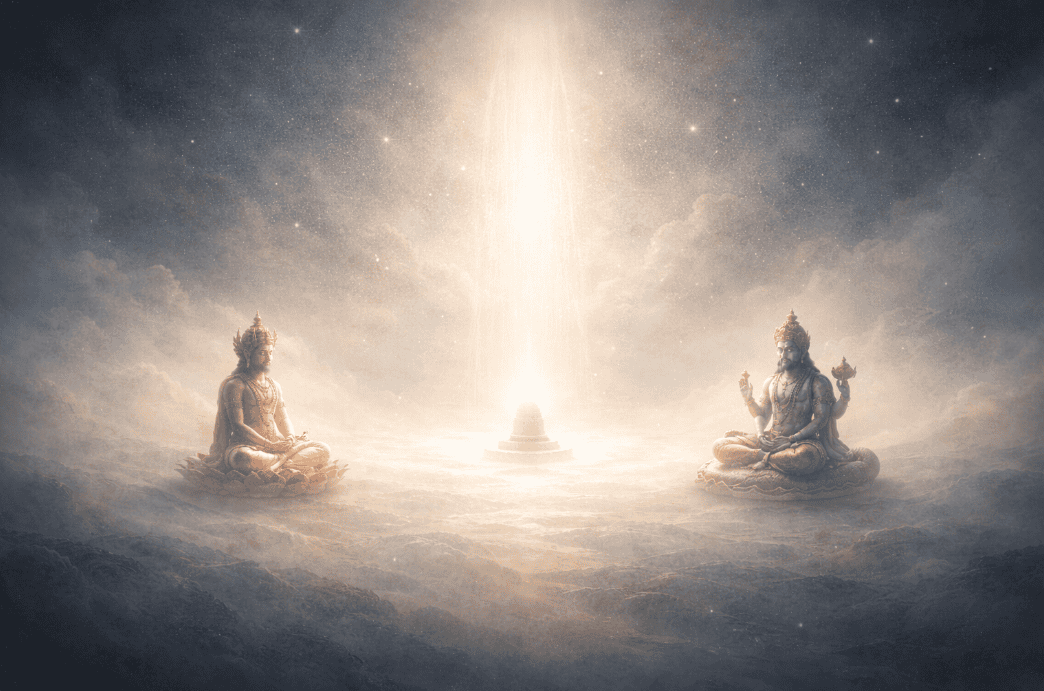 Against this global pattern, Hindu cosmology offers a striking alternative. One of its most important resolutions of supremacy contains no battle, no punishment, and no destruction at all.