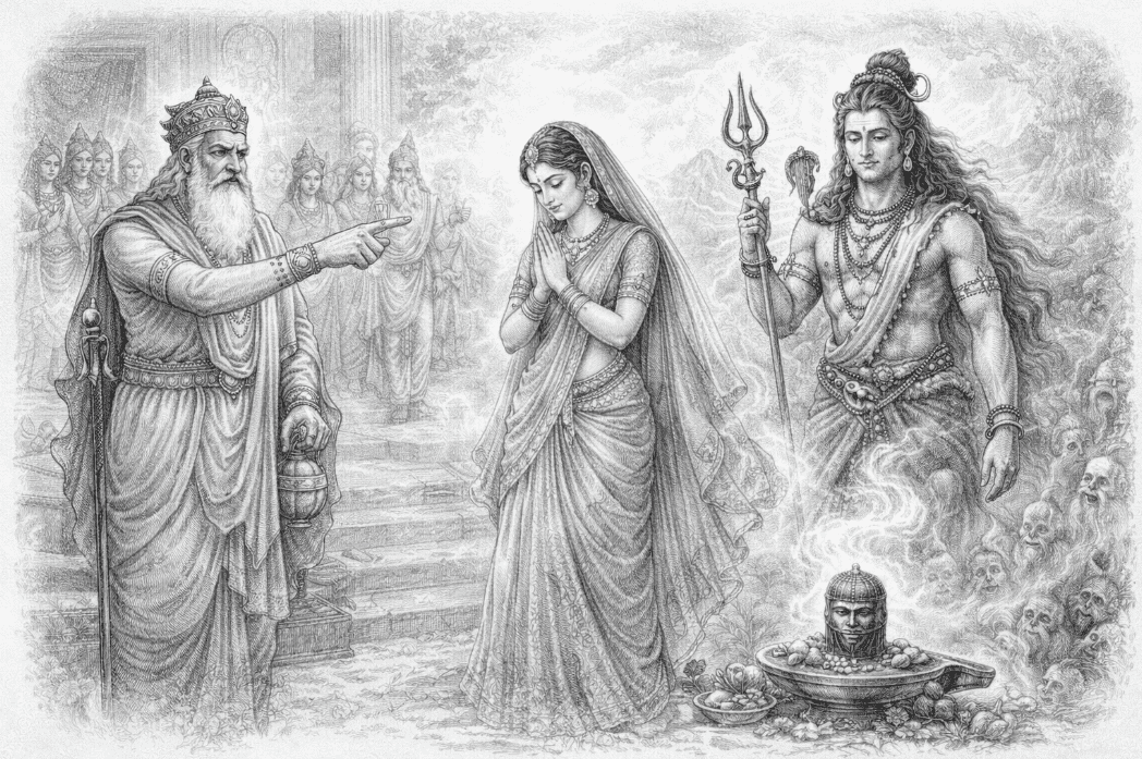 Puranic narratives describe her choice as firm and deliberate, even as her father’s resistance intensified. Her resolve reveals a tension central to the myth: ritual authority and social order on one side, and transcendence beyond convention on the other.