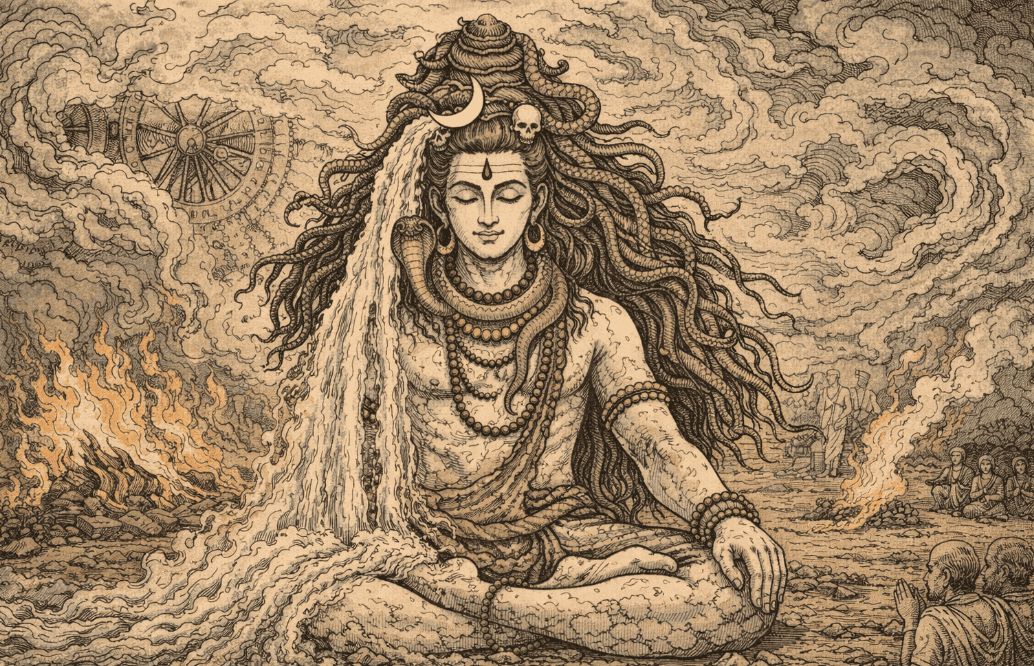 Shiva’s matted locks are not an incidental ascetic feature. They are a symbolic vessel that contains destructive forces, spiritual energy, and cosmic movement itself. From restraining the descent of the Ganga to embodying controlled chaos and renunciation, the jata reveals Shiva’s unique role as cosmic stabilizer.