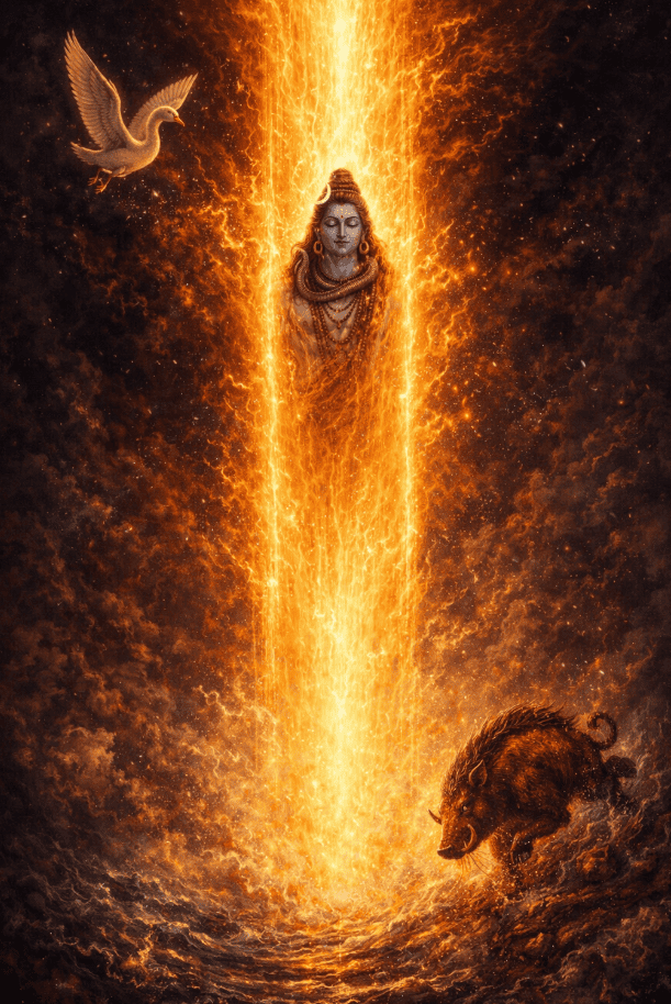 To settle the fight, a huge pillar of fire appeared between them. It had no beginning or end, it stretched infinitely up and down. Brahma turned into a swan and flew upward to find the top. Vishnu became a boar and dug downward to find the bottom. They searched for thousands of years but could not find either end.